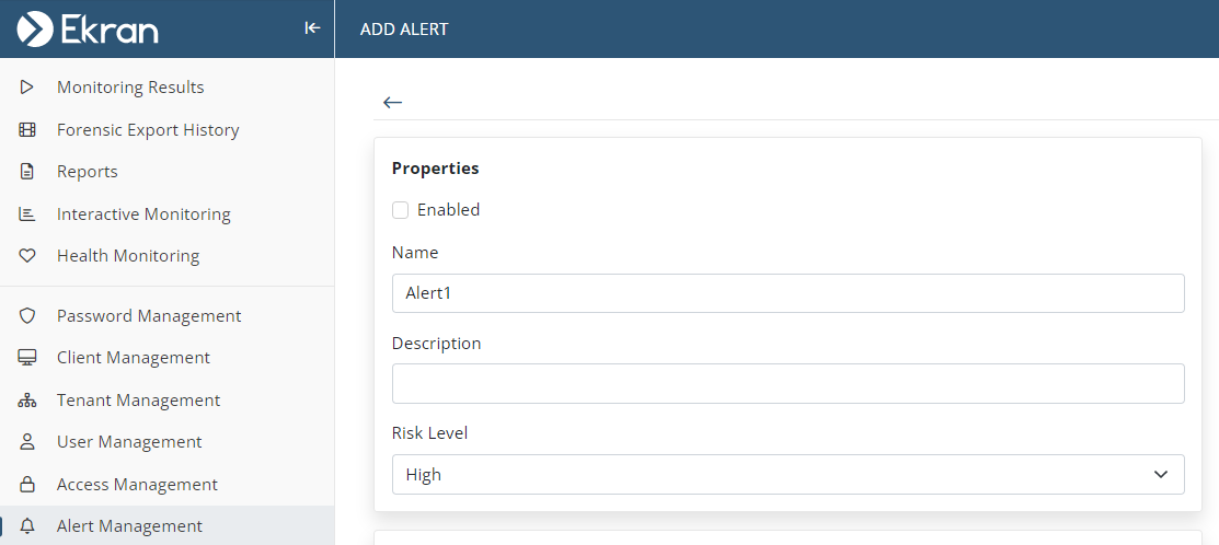 Kliknij link nawigacyjny Zarządzanie alertami (po lewej), a następnie kliknij przycisk Dodaj w prawym górnym rogu strony Zarządzanie alertami.