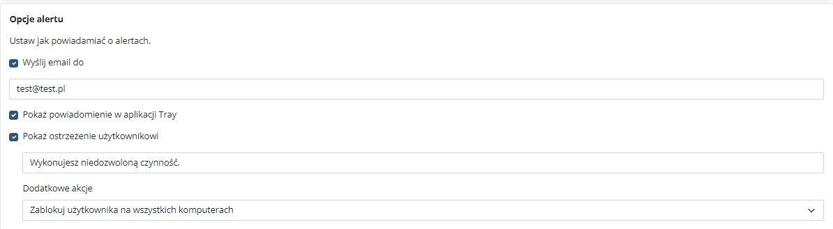 - Zaznacz pole wyboru Pokaż ostrzeżenie użytkownikowi, jeśli chcesz, aby po uruchomieniu alertu użytkownikowi wyświetlał się komunikat ostrzegawczy na ekranie (można użyć domyślnego komunikatu lub wpisać własny tekst w polu poniżej).