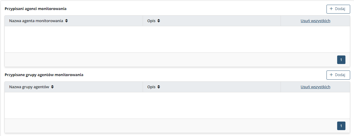 W sekcjach Przypisani agenci monitorowania oraz Przypisane grupy agentów monitorowania wybierz agentów / grupy agentów monitorowania, do których alert ma zostać przypisany, klikając Dodaj.