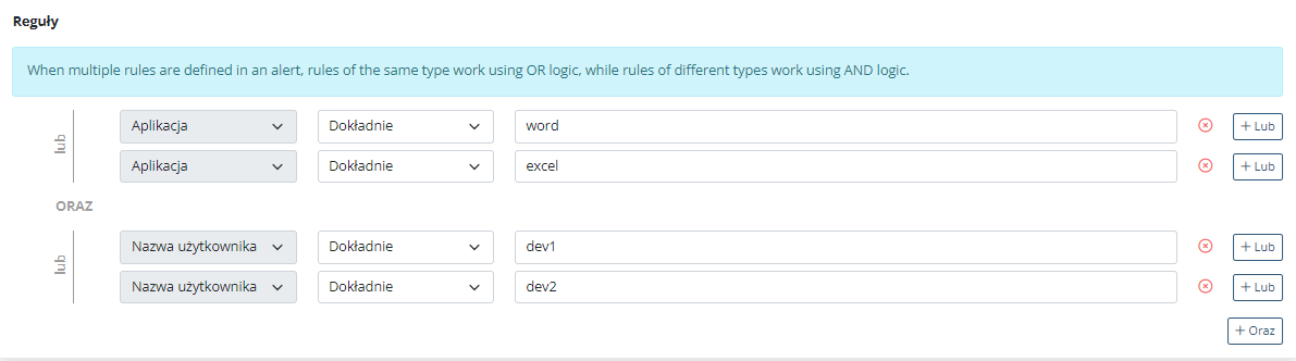 - Aby dodać wiele zasad do alertu (działających razem zgodnie z logiką LUB/I): kliknij przycisk "+ LUB" lub "+ ORAZ".