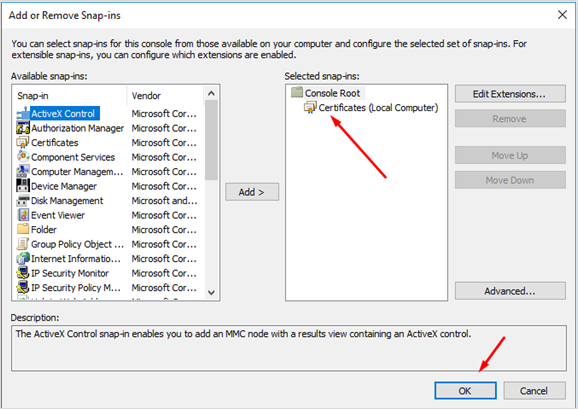 W oknie Dodawanie lub usuwanie przystawek, zaznacz Certyfikaty, a następnie kliknij Dodaj.