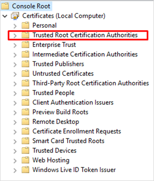 W drzewie Certyfikaty (komputer lokalny), znajdź węzeł Zaufane główne urzędy certyfikacji.