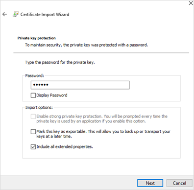 Na stronie Ochrona klucza prywatnego, wpisz hasło certyfikatu i kliknij Dalej.