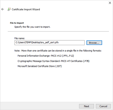 Na stronie Plik do zaimportowania, kliknij Przeglądaj, aby wskazać plik certyfikatu, a następnie kliknij Dalej.