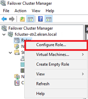 - W Menedżerze klastra pracy awaryjnej kliknij prawym przyciskiem myszy Role i wybierz Configure Role.