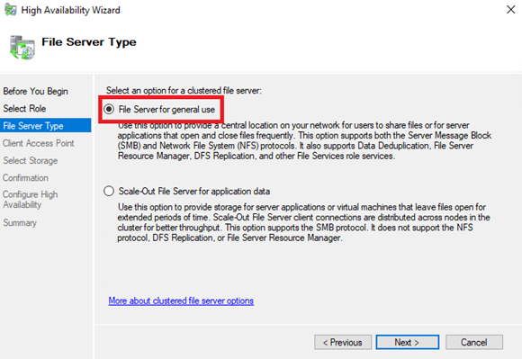 - Na stronie File Server Type pozostaw domyślnie wybraną opcję File Server for general use.