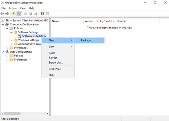 - Kliknij prawym przyciskiem myszy pozycję Software installation i z menu kontekstowego wybierz polecenie New > Package.