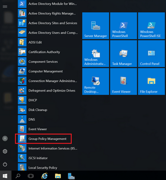 - W kontrolerze domeny użyj menu Start systemu Windows, aby otworzyć Narzędzia administracyjne i kliknij Zarządzanie zasadami grupy.