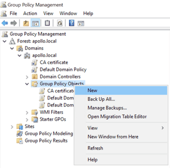 - Kliknij prawym przyciskiem myszy Group Policy Objects i wybierz New (w menu kontekstowym).