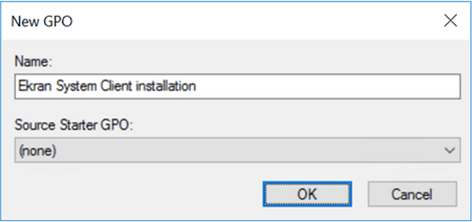 - W otwartym oknie New GPO wprowadź nazwę nowego obiektu zasad grupy (np. Syteca Client installation), a następnie kliknij OK.