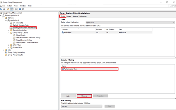 - Na karcie Scope w sekcji Security Filtering kliknij opcję Authenticated Users, a następnie kliknij przycisk Remove u dołu.