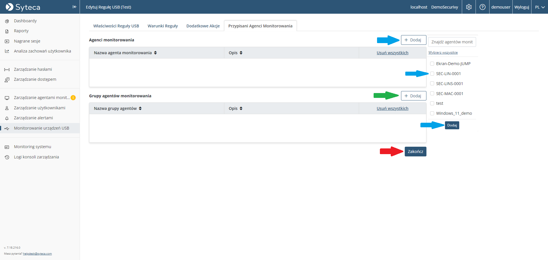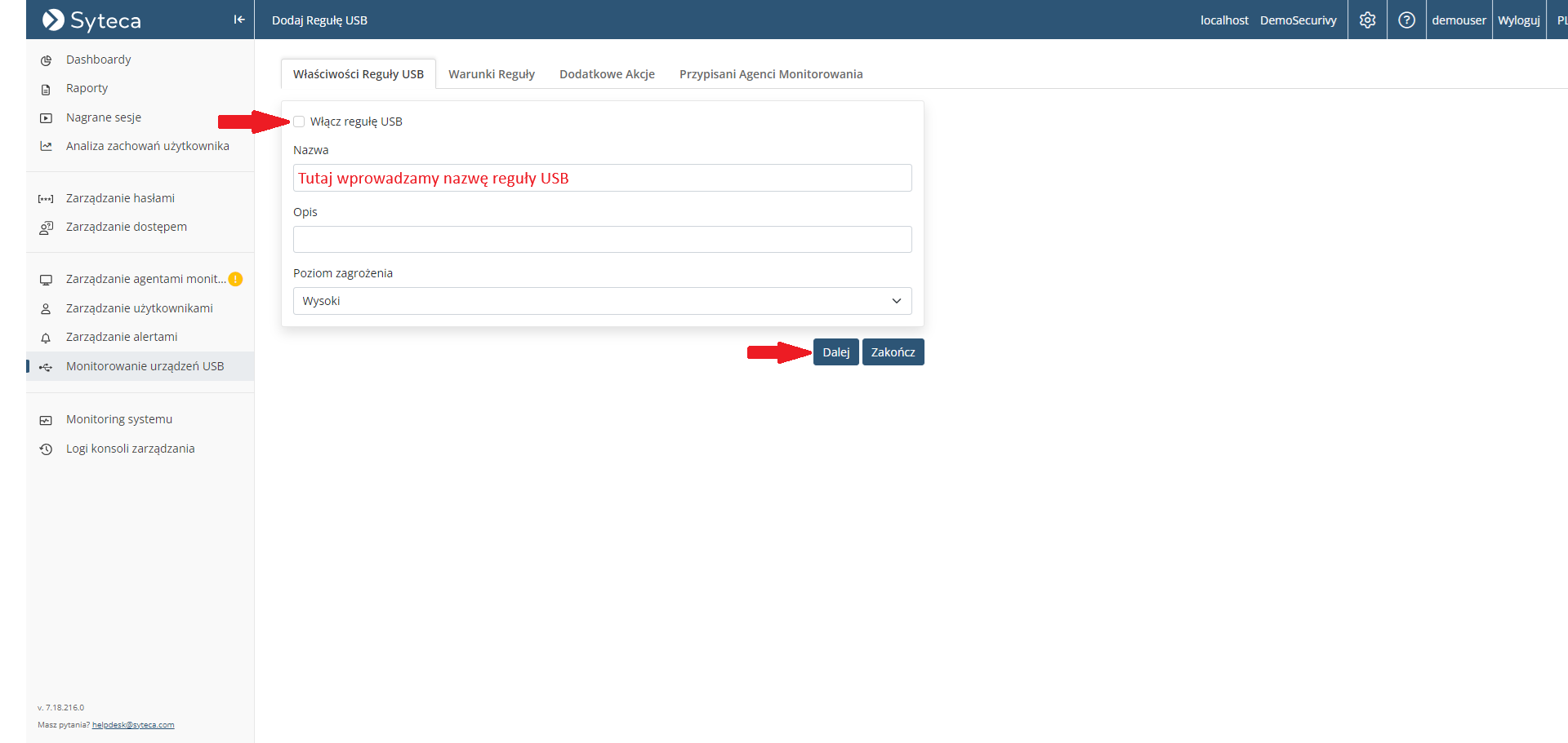 Tworzenie nowej reguły monitorowania urządzeń USB w Syteca SaaS