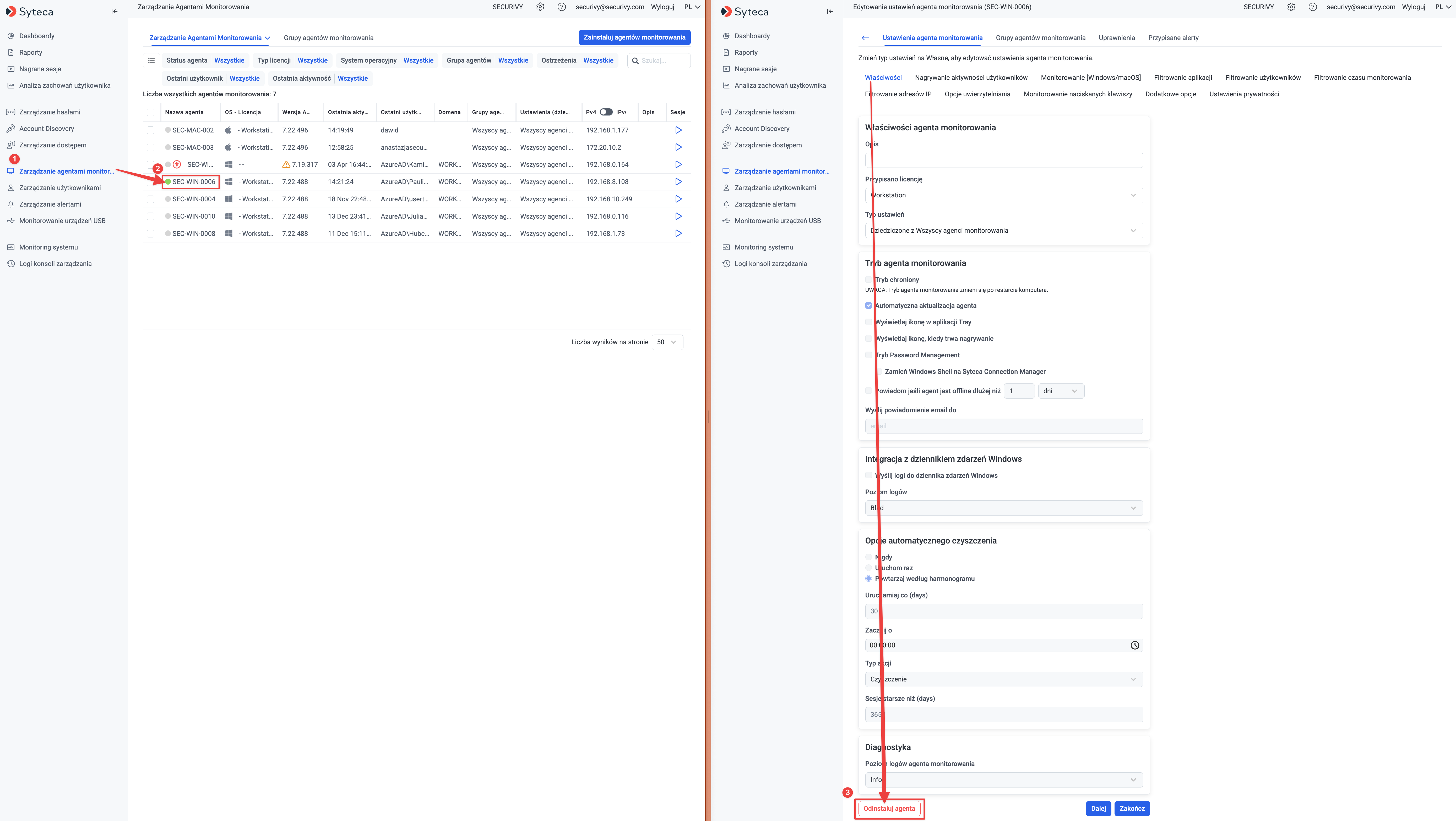 Odinstalowanie agenta monitorowania Syteca SaaS odbywa się zdalnie za pomocą konsoli zarządzania i jest procesem dwuetapowym. Najpierw dezinstalujemy agenta z wybranego komputera poprzez polecenie „Odinstaluj agenta monitorowania” w konsoli – skutkuje to usunięciem oprogramowania agenta z urządzenia i zatrzymaniem monitoringu, przy jednoczesnym zachowaniu dotychczas zebranych danych. Następnie, jeżeli zachodzi taka potrzeba, możemy zlecić całkowite usunięcie tego agenta (wpisu oraz danych) z systemu, kontaktując się z obsługą Syteca. Dzięki temu podejściu bezpieczeństwo jest zachowane – pracownicy nie mogą samodzielnie odinstalować agentów – a administratorzy mają pełną kontrolę nad tym, które hosty są monitorowane i kiedy usunięte wpisy agentów oraz dane są trwale kasowane.