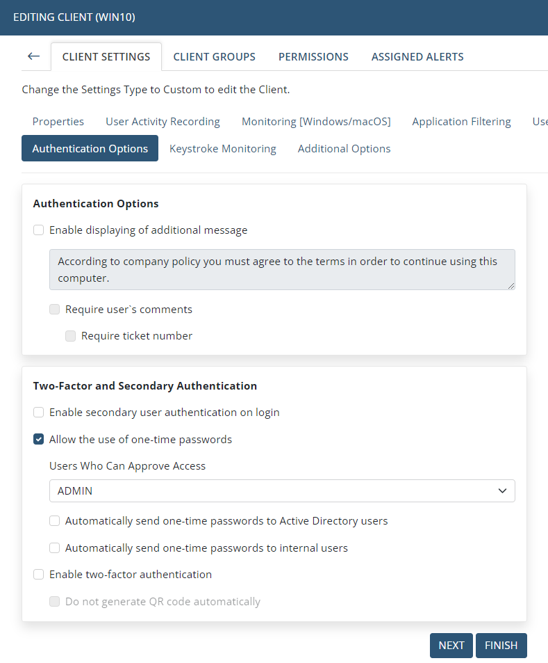 Następnie, na otwartej stronie Edycja agenta (lub Edycja grupy agentów), przejdź do zakładki Opcje uwierzytelniania i przewiń do sekcji Uwierzytelnianie dwuskładnikowe i dodatkowe. Wybrani użytkownicy zaufani (zatwierdzający) będą wyświetleni pod polem wyboru Zezwalaj na użycie haseł jednorazowych, na rozwijanej liście Użytkownicy mogący zatwierdzać dostęp.