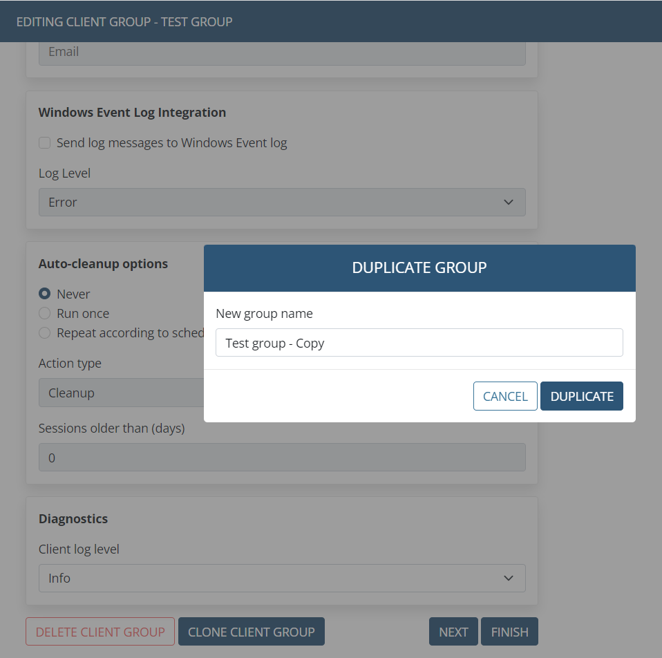Uwaga: Po sklonowaniu nowa grupa jest pusta (tzn. nie zawiera żadnych agentów) i wymagani agenci mogą zostać do niej dodani w zwykły sposób (np. za pomocą przycisku Akcja zbiorcza na karcie Zarządzanie agentami).