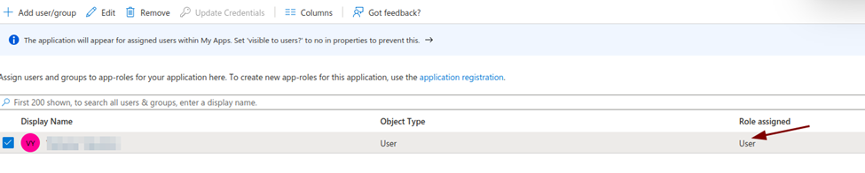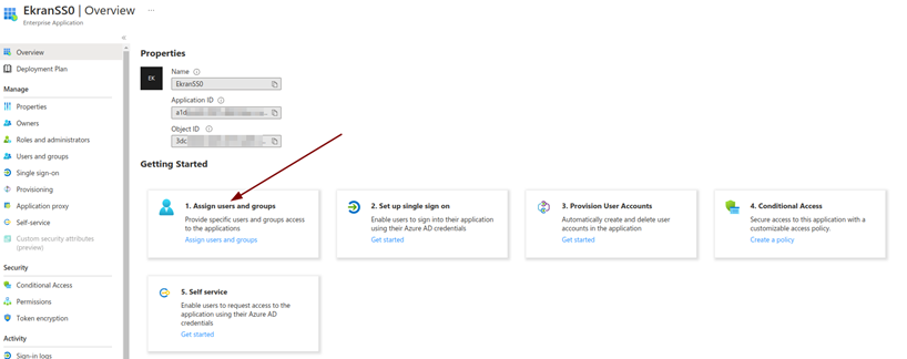 Wybierz opcję Assign users and user groups (Przypisz użytkowników i grupy użytkowników), aby dodać użytkownika lub grupę do utworzonej aplikacji.