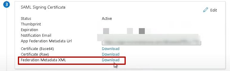 Na stronie Set up Single Sign-On with SAML przewiń w dół do sekcji SAML Signing Certificate i pobierz plik metadanych Federation Metadata XML jako