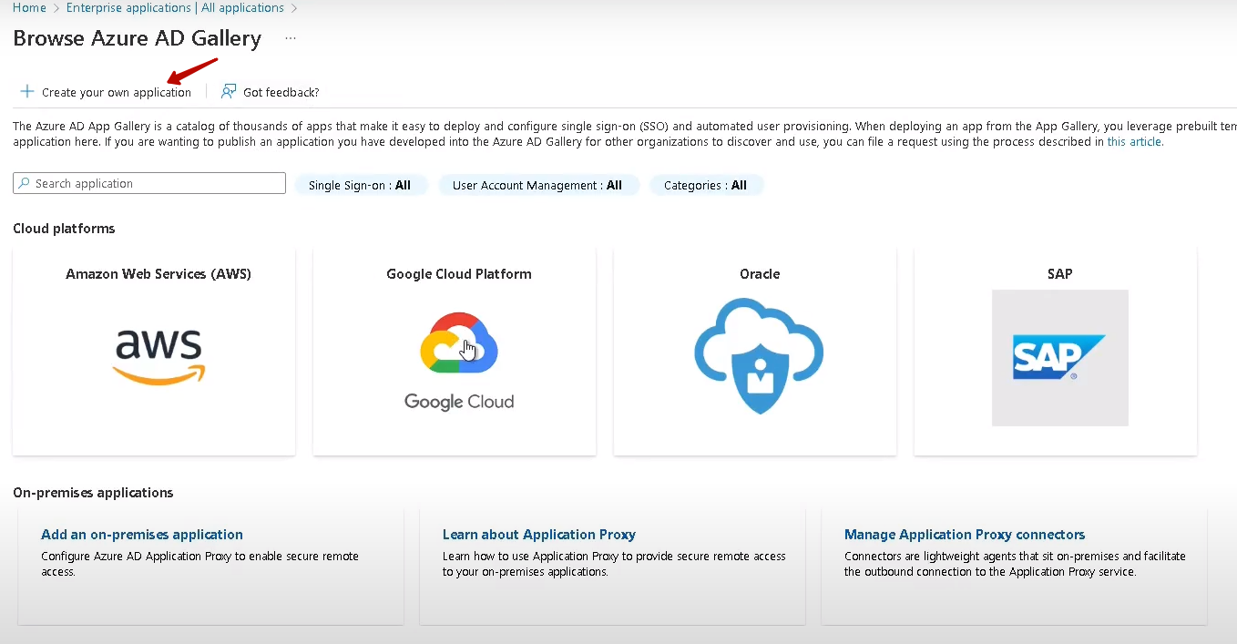 Na stronie Enterprise applications kliknij New application (Nowa aplikacja), a następnie na kolejnej stronie kliknij Create your own application (Utwórz własną aplikację).