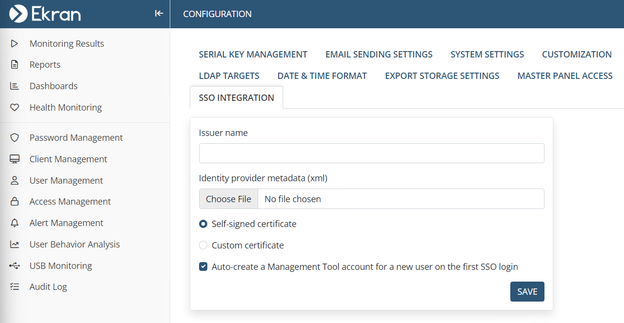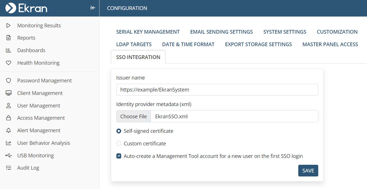 Zaloguj się do Konsoli Zarządzania, kliknij przycisk Konfiguracja (na górze interfejsu), a następnie wybierz zakładkę Integracja z SSO.