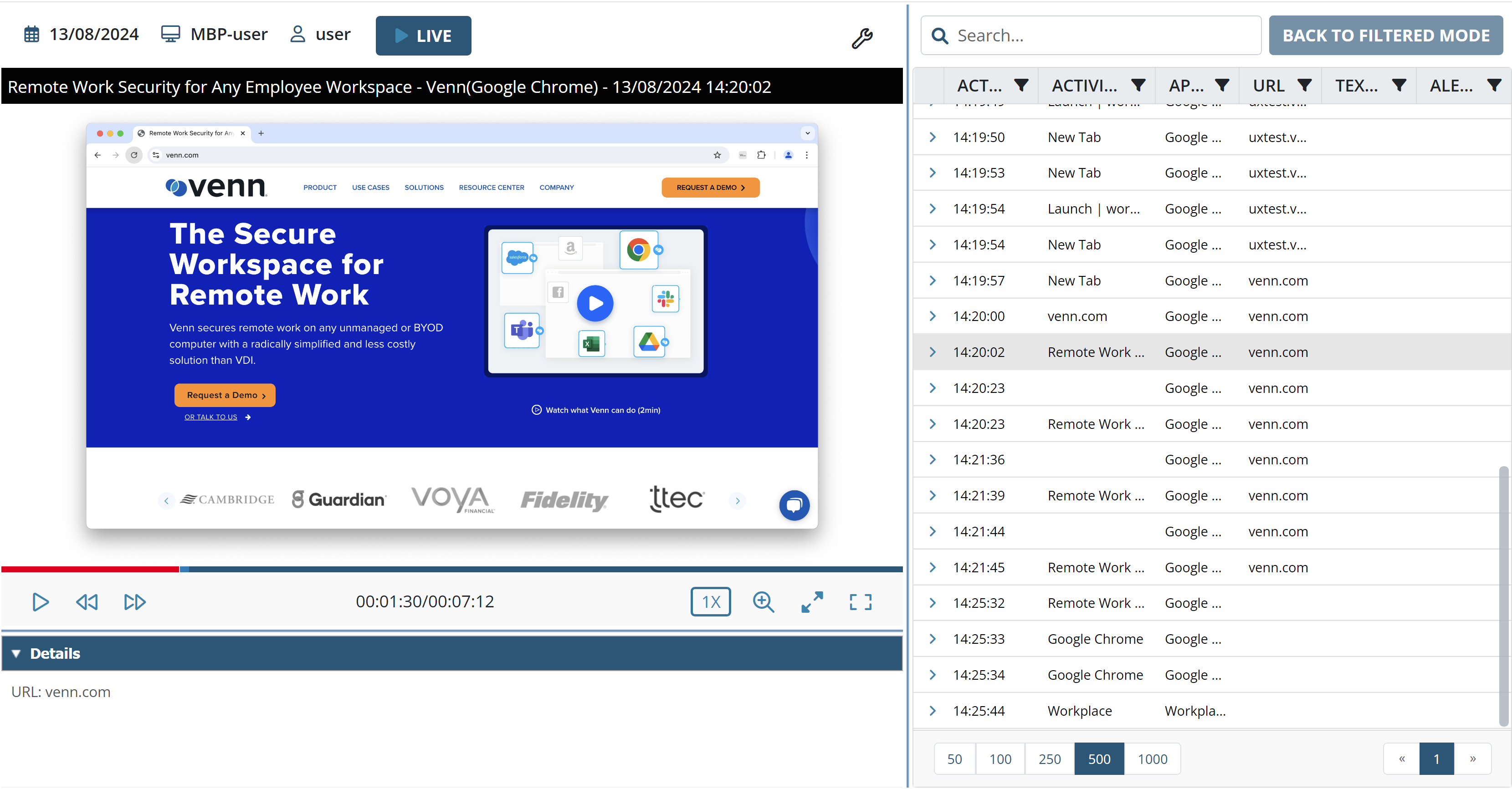 Syteca jest zintegrowana z launcherem aplikacji Venn, umożliwiając monitorowanie wyłącznie aktywności użytkownika w aplikacjach uruchomionych w przestrzeni roboczej Venn na komputerach z systemami Windows i macOS wyposażonych w agenta monitorowania.
