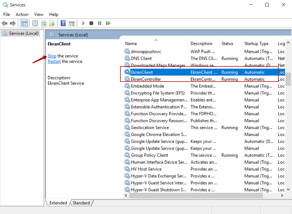 - Otwórz Usługi systemu Windows i zatrzymaj usługi EkranClient i EkranController.
