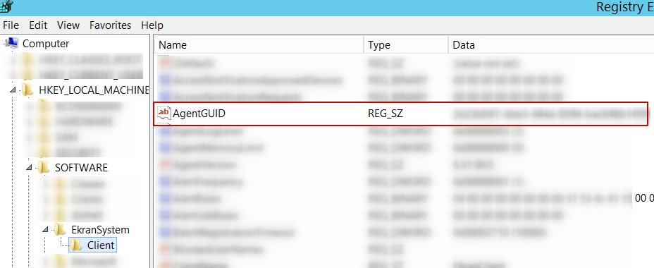 - Otwórz Edytor rejestru systemu Windows i w kluczu HKEY_LOCAL_MACHINE\SOFTWARE\EkranSystem\Client wykonaj następujące czynności, a następnie zapisz zmiany: