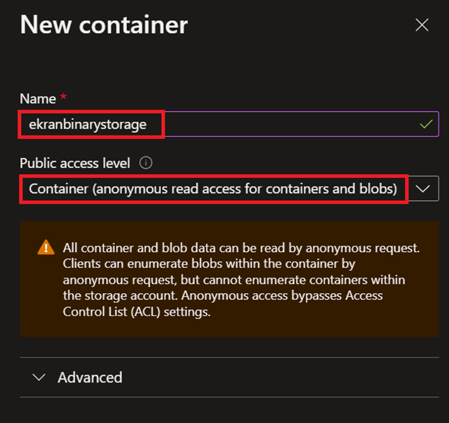 Wprowadź nazwę kontenera i w polu Public access level wybierz Container (anonymous read access for containers and blobs).