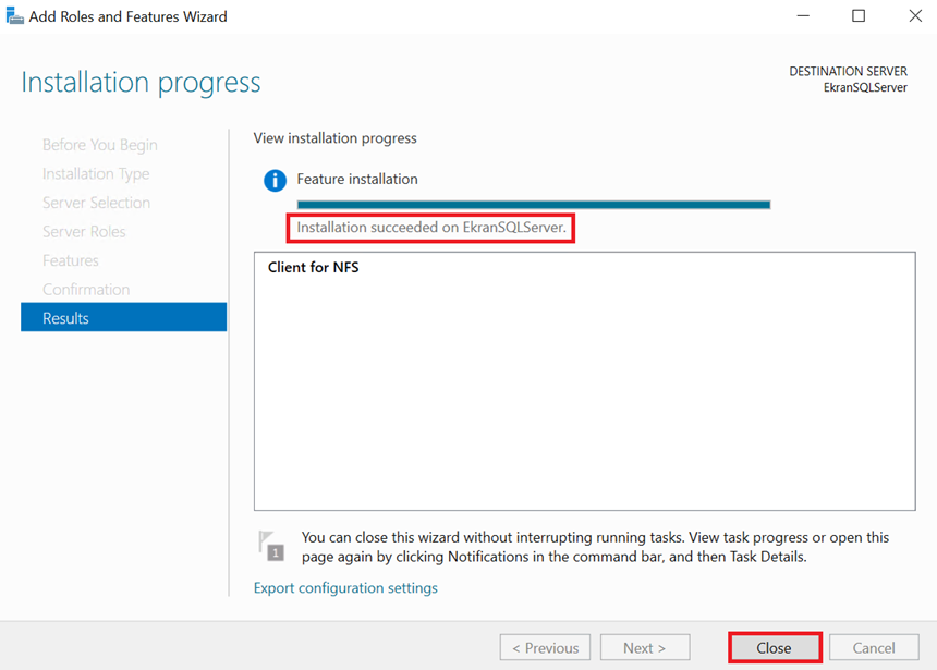 W sekcji Features zaznacz Client for NFS, kliknij Next, a następnie zainstaluj.