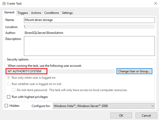 Na zakładce General ustaw użytkownika SYSTEM.