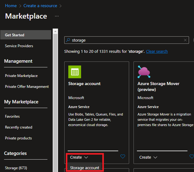 Wybierz Storage account, kliknij Create.