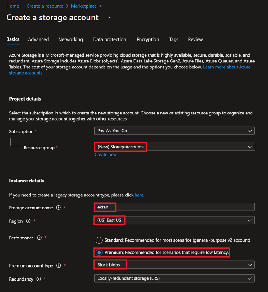 Premium account type – wybierz Block blobs.