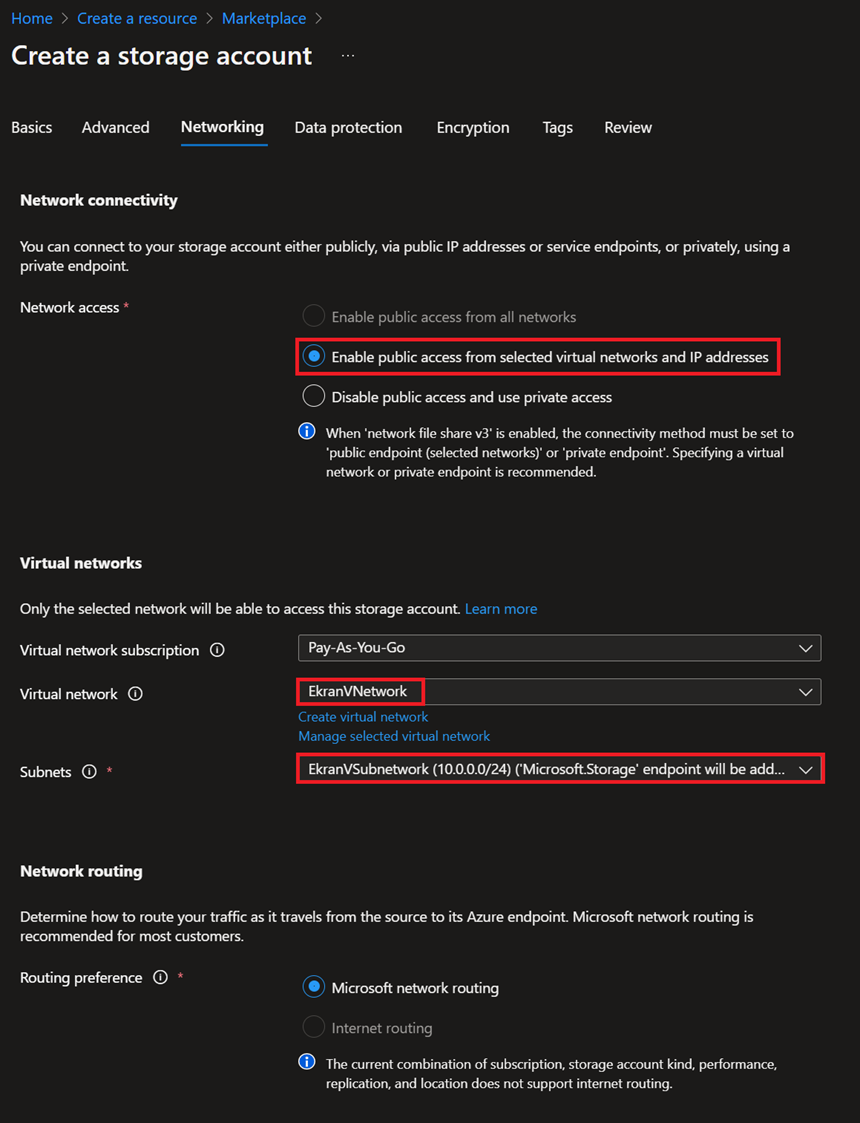 Upewnij się, że wybrano opcję Enable public access from selected virtual networks and IP addresses, a następnie wybierz tę samą sieć wirtualną, co dla Syteca.