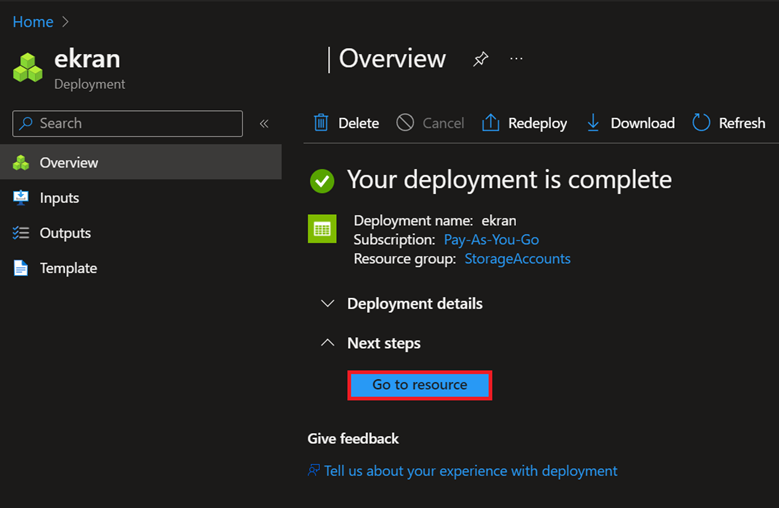 Kliknij Review i następnie Create. Po zakończeniu wdrażania kliknij Go to resource.