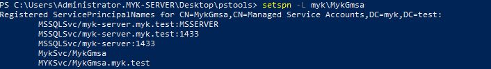 setspn -S MSSQLSvc/myk-server.myk.test:1433 myk\MykGmsa - Sprawdź dodane SPN, uruchamiając następujące polecenie: