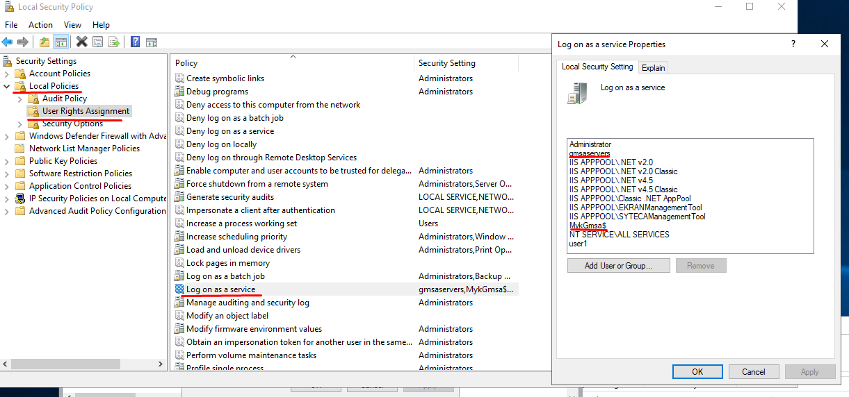- Sprawdź, czy zostały przyznane uprawnienia do Log on as a Service. Otwórz msc > Local Policies > User Rights Assignment > Log on as a service.