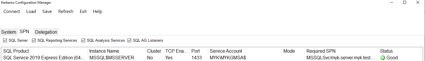 - Warto sprawdzić, jakie SPN są zarejestrowane dla gMSA i czy wśród nich znajduje się MSSQLSvc\<SQLServerFQDN>. Można skorzystać z Microsoft Kerberos Configuration Manager for SQL Server, który jest narzędziem, w którym nie tylko można sprawdzić poprawność zarejestrowanych SPN, ale także można je naprawić kilkoma kliknięciami.