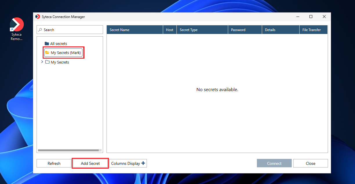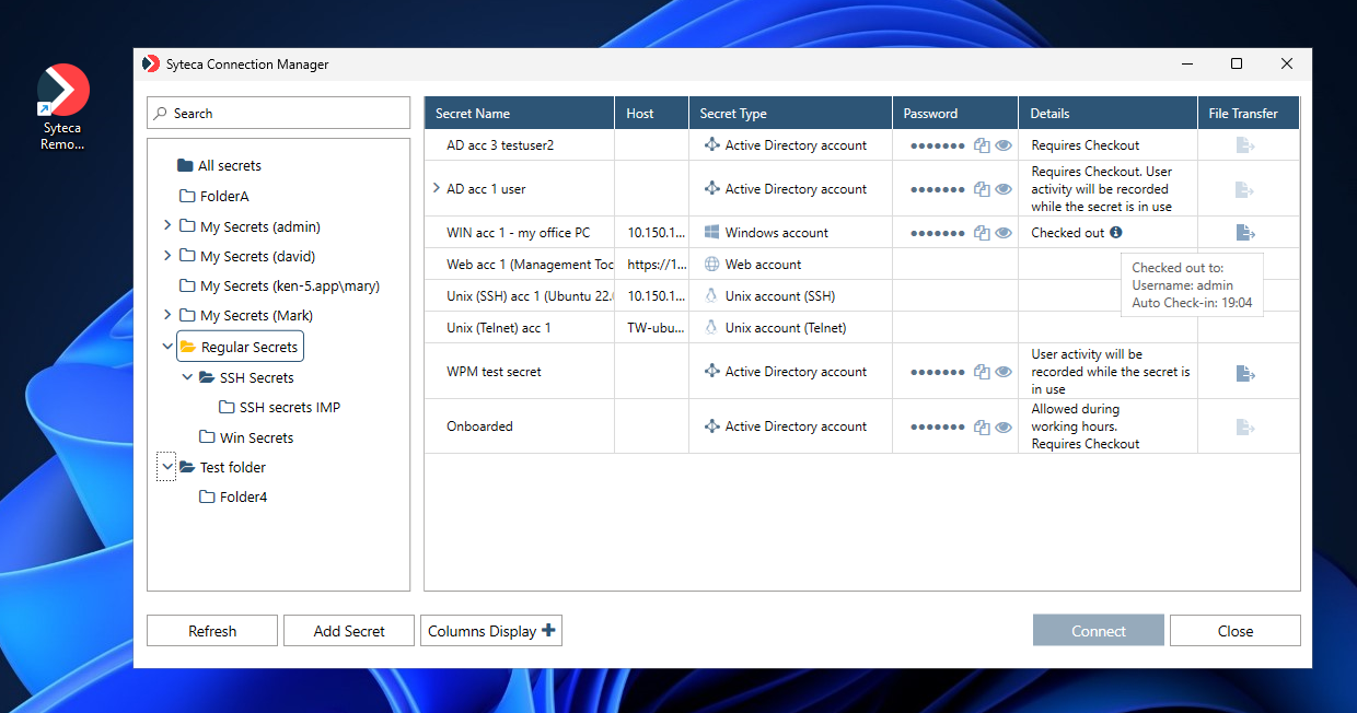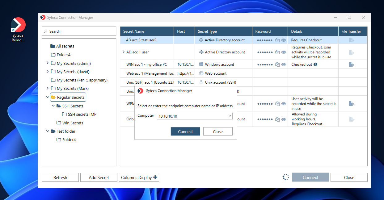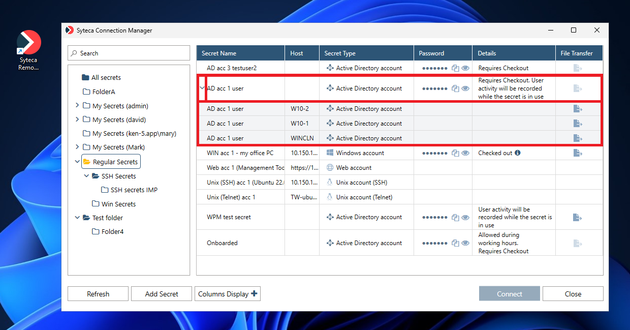 Użytkownicy łączą się z kontami zapisanymi w poświadczeniach (do których mają przypisane odpowiednie uprawnienia) za pomocą Menedżera Połączeń Syteca.