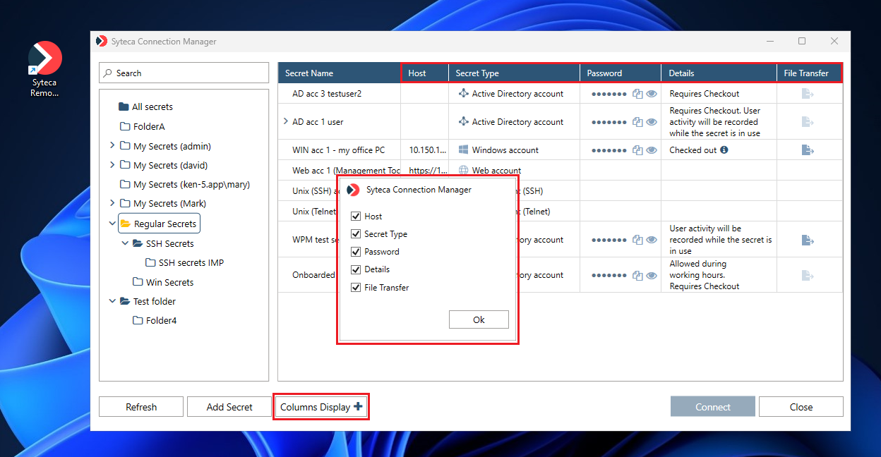 2. Zmiana kolumn wyświetlanych w Menedżerze Połączeń Syteca