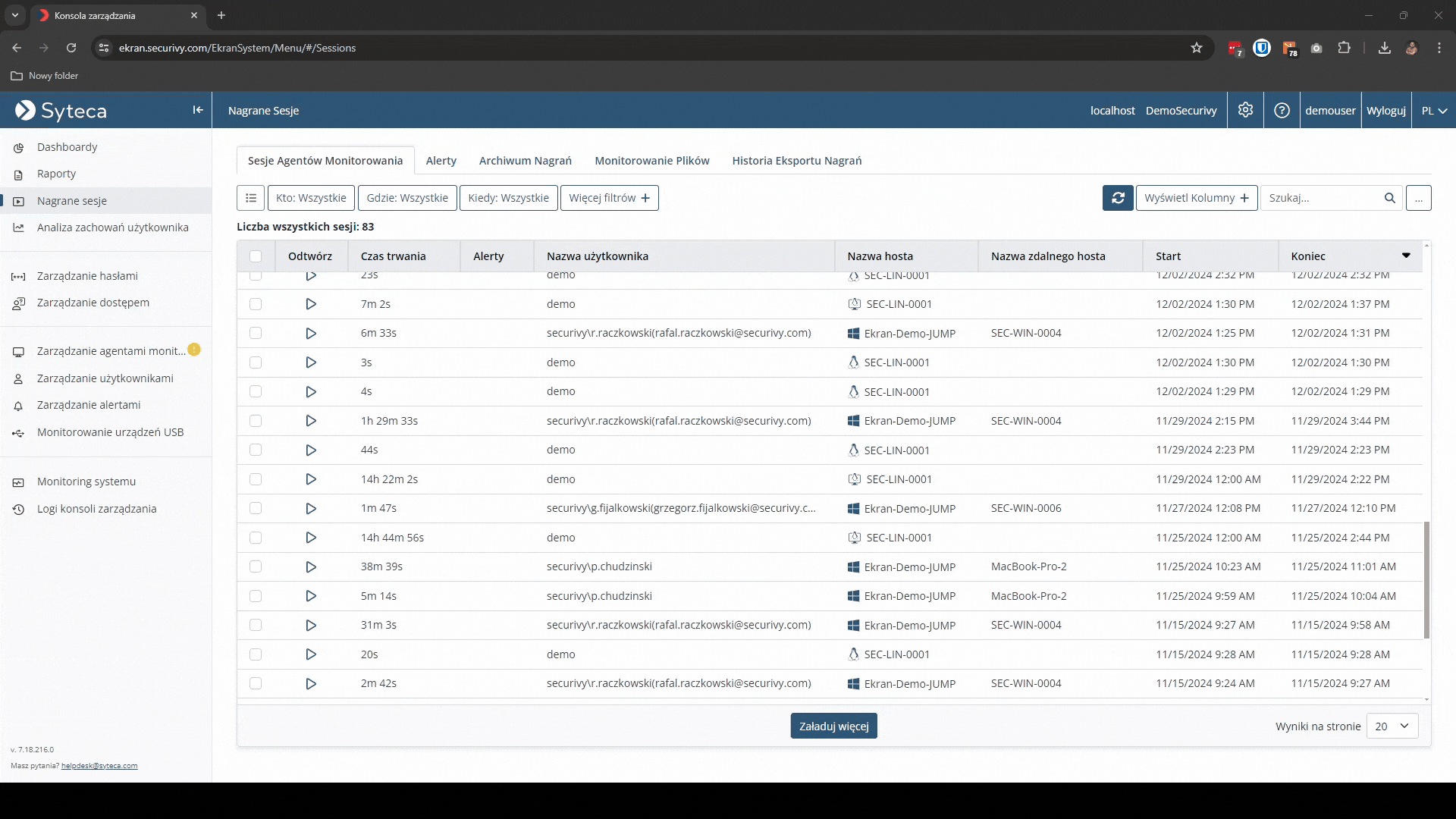 Wybierz monitorowaną stację roboczą. Wyświetlona lista sesji umożliwi szczegółowe przeglądanie zarejestrowanych aktywności.