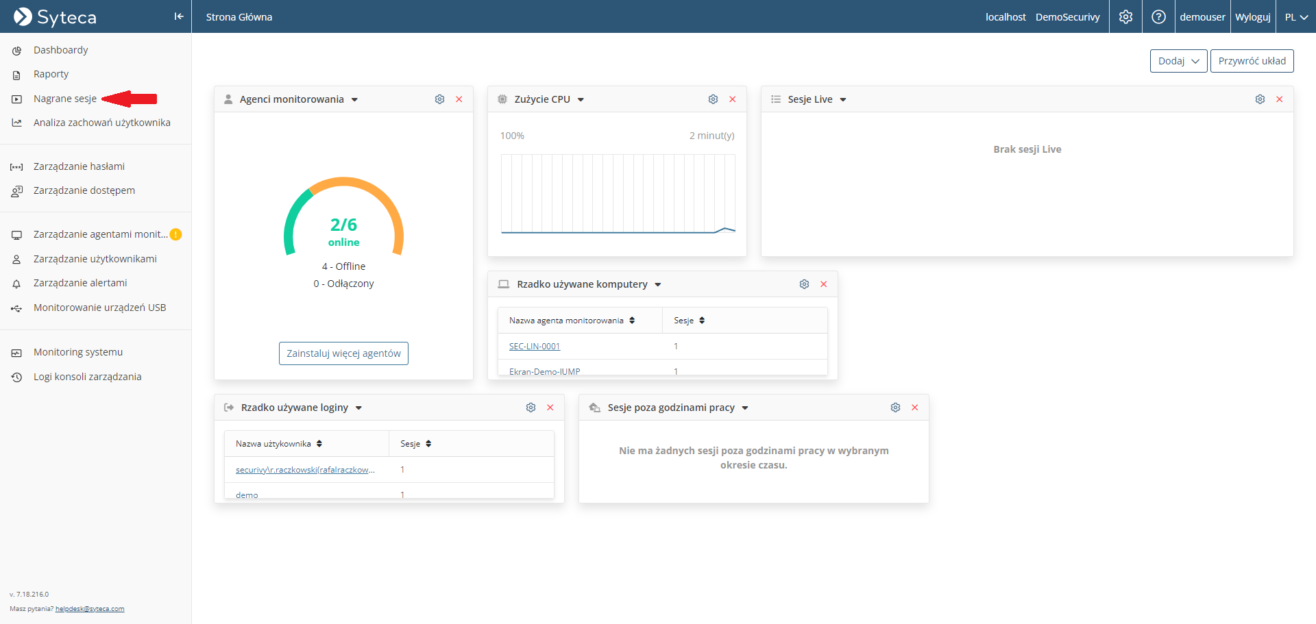 Uwaga: Pamiętaj, że sesje będą rejestrowane dopiero po zainstalowaniu agenta Syteca SaaS na komputerze, który ma być rejestrowany.