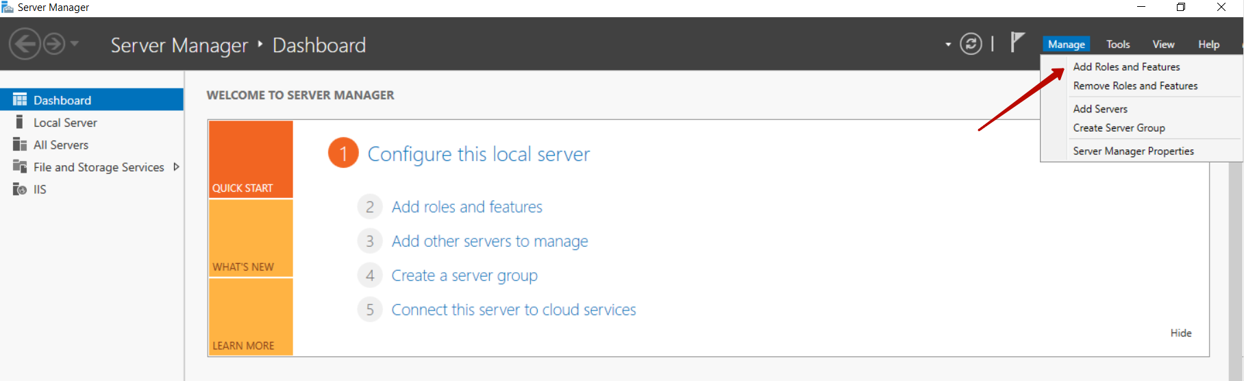 Otwórz Server Manager, kliknij Manage, a następnie wybierz Add Roles and Features.