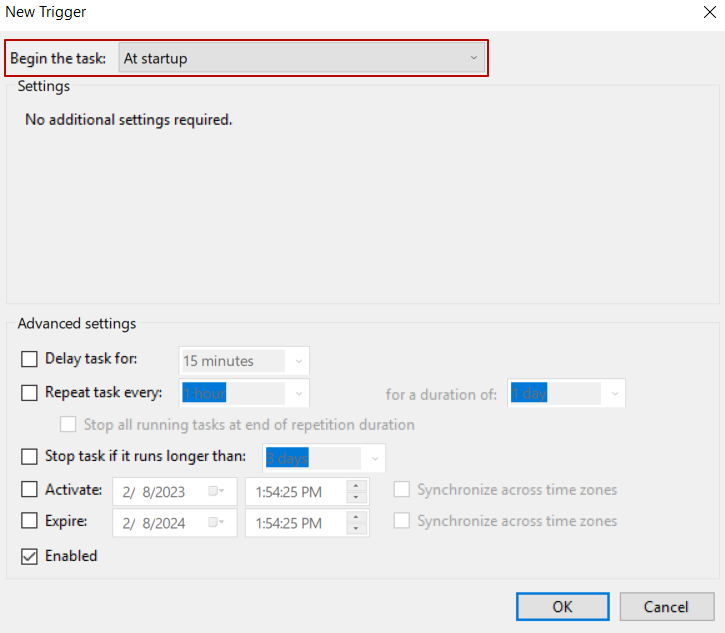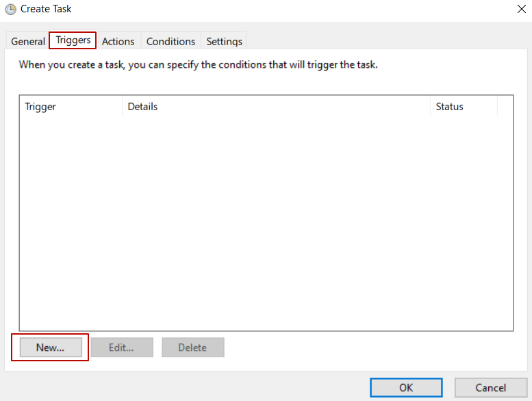 Przejdź do zakładki Triggers, kliknij New, a następnie w polu Begin the task wybierz At startup i kliknij OK.