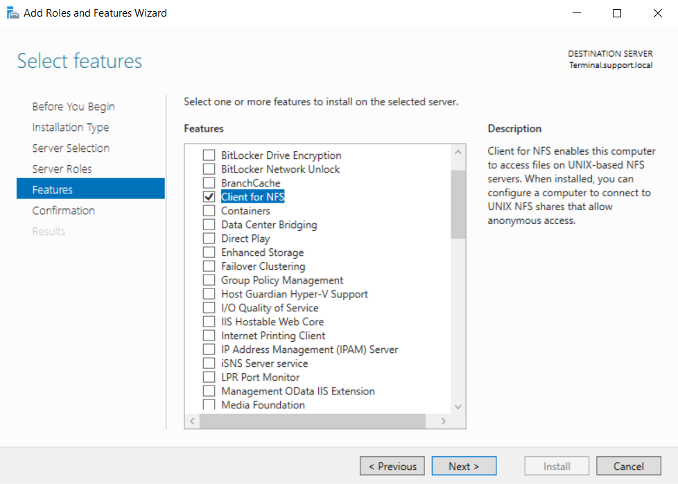 W sekcji Features zaznacz opcję Client for NFS, aby ją włączyć.