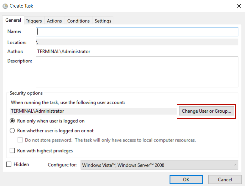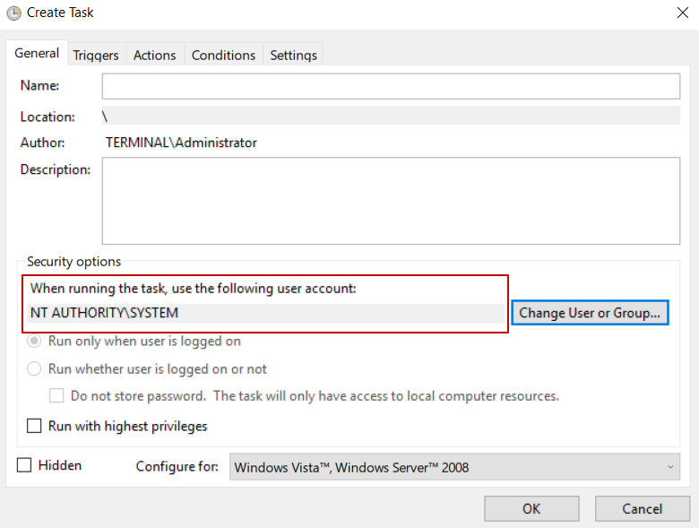 SYSTEMi kliknij OK – w polu użytkownika pojawi się terazNT AUTHORITY\SYSTEM.