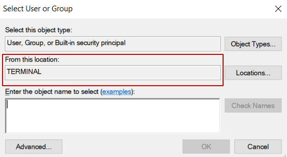Upewnij się, że pole From this location wskazuje nazwę lokalnego komputera (jeśli nie, kliknij Locations i wybierz nazwę lokalną).