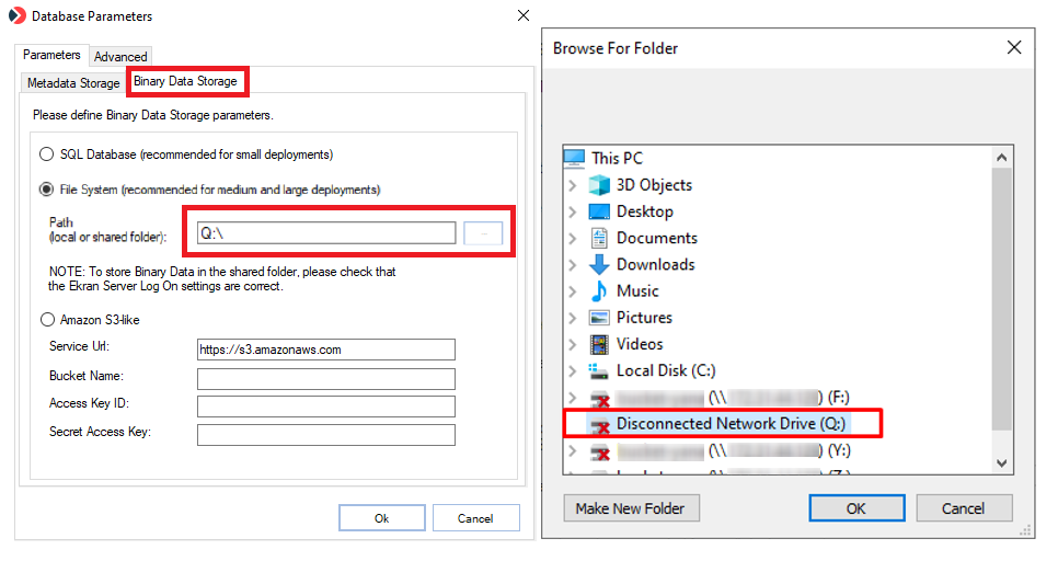 W aplikacji Database Parameters (DbSetupToolUI) przejdź do zakładki Binary Data Storage, a następnie w polu File System > Path wybierz zamontowany wcześniej dysk sieciowy.