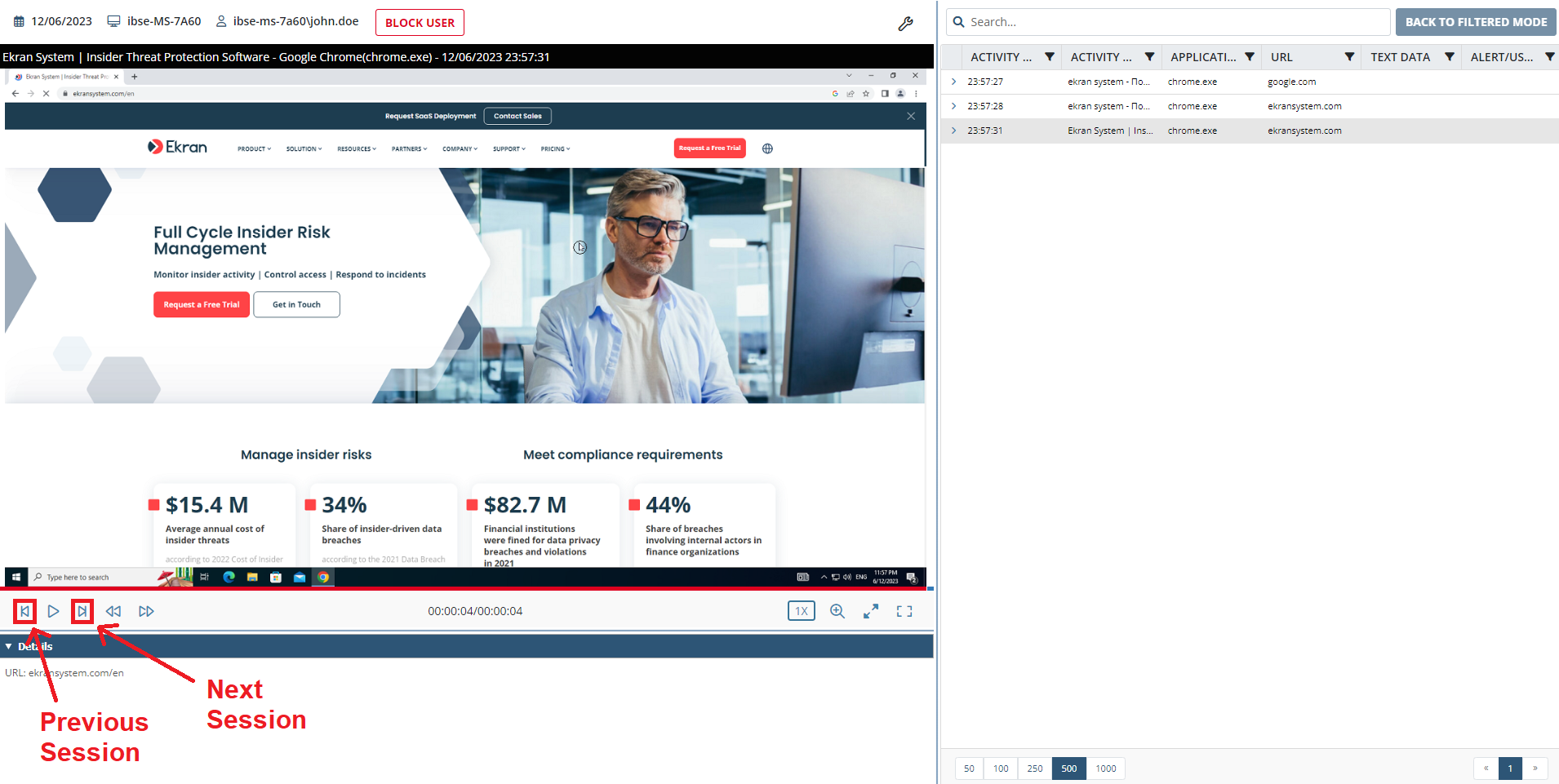 Odtwarzacz Sesji to główny panel w interfejsie Podglądu sesji, znajdujący się w lewym górnym rogu. Umożliwia on przeglądanie zarejestrowanych zrzutów ekranu z komputerów z zainstalowanym agentem monitorowania dla systemów Windows lub macOS, a także graficzną reprezentację danych z terminala Linux (czyli dane wejściowe i wyjściowe widoczne dla użytkownika w terminalu).
