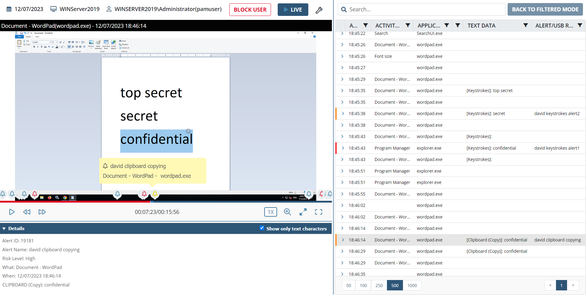 Podczas odtwarzania sesji agenta Windows możliwe jest przeglądanie zrzutów ekranu w obszarze Odtwarzacza sesji wraz z powiązanymi metadanymi (takimi jak: Czas aktywności, Tytuł aktywności, Nazwa aplikacji, URL, Dane tekstowe – w przypadku naciśnięć klawiszy, operacji schowka lub przesyłania plików – oraz Reguła alertu/USB) w siatce metadanych.