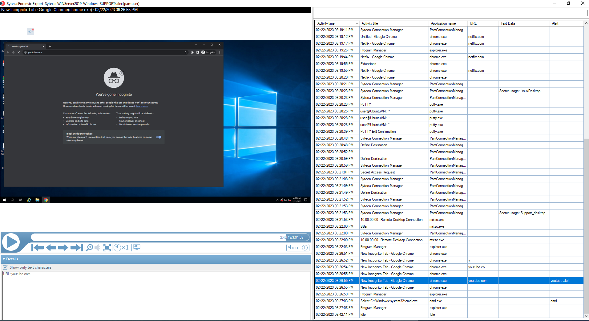 Sesje są odtwarzane w aplikacji Syteca Forensic Player.