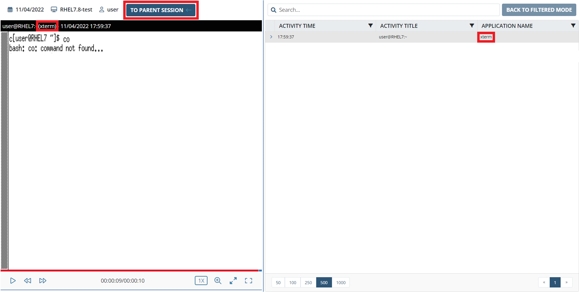 Funkcjonalność podglądu i odtwarzania tych sesji różni się nieco od standardowego sposobu i została opisana poniżej. Aplikacje GUI są monitorowane jako osobne sesje podrzędne (child) typu X-forwarded, przypisane do sesji nadrzędnej SSH (parent).